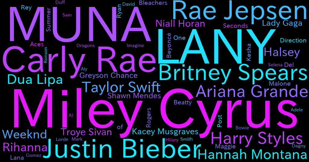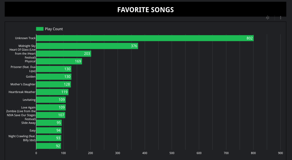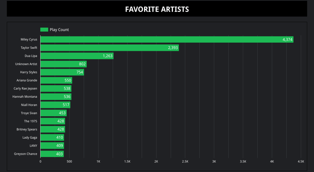 The next visualization I received was my Favorite Artists. What this data shows is how many songs I’ve streamed from each artist. Unsurprisingly, Miley Cyrus is my top artist (as she has been every year) and she almost doubles Taylor Swift’s plays, the next most-listened to artist here. If we eliminate whoever “Unknown Artist” is supposed to be (though if I had to guess, it is most likely the unofficial released songs of Miley Cyrus), then we can conclude that I listen to mostly female artists, but the disparity is not that great with 8 out of 14 versus 6 out of 14. But if we total the amount of plays by gender, I predominately listen to music made by female artists (as it should be). Next, we’ll move on to my most played songs.
