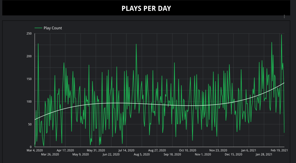 We’re going to ignore “Unknown Track” like we ignored “Unknown Artist” for this analysis. Unsurprisingly again, Miley Cyrus dominates my most-listened to songs list with half of the entries shown. In my defense, she released a new album this past year. Dua Lipa is the only other artist to have more than one entry in this visualization (“Physical”, “Levitating”, and “Love Again”), but what is more interesting is that the rest of the entries are songs by male artists. Also, if you remember from my second visualization, Taylor Swift was my second most-listened to artist, but none of her songs appear in the top fourteen most-listened to songs of this whole year. What is not shown in the data is that Taylor Swift’s catalogue is far bigger (nine albums) than Dua Lipa’s (two albums), which might explain why she has more overall plays, but not as many plays for specific songs. Moving on from this data set, we’ll see days that saw me using Spotify a lot.