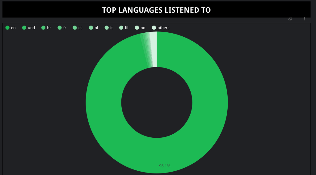 This visualization might be the best way to guess where I was and what I was doing on a particular day, especially where there are spikes and dips. From the beginning, between March 4th and March 26th, we can guess that I did not use Spotify that much when the pandemic first struck. This period sees the lowest amount of plays per day overall. Between July 14th and August 27th, we see the amount of plays per day steadily increasing, so much so that the plays per day never get as low as the former date. Instead, there is a general uptick, which could be explained by the summer break. Lastly, from January 6th to February 19th, we see the plays per day finally reaching their greatest peak since I first started using Spotify. This can definitely be explained by my having an internship where I spend sixteen hours a week reading manuscripts and having Spotify on as background noise. The final visualization depicts the variety of languages of the music I’ve listened to in the past year.